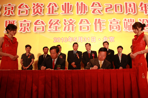 中國臺(tái)灣網(wǎng)5月31日北京消息 北京臺(tái)資企業(yè)協(xié)會(huì)成立二十周年慶典活動(dòng)暨京臺(tái)經(jīng)濟(jì)合作高端論壇31日在京舉行,北京臺(tái)協(xié)與臺(tái)灣省農(nóng)會(huì)、“中國生產(chǎn)力中心”、金屬研究中心、臺(tái)北企業(yè)經(jīng)理人協(xié)進(jìn)會(huì)和海峽救助協(xié)會(huì)等島內(nèi)團(tuán)體簽署了長期合作協(xié)議。
