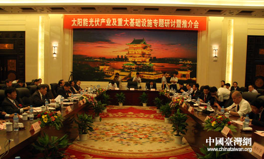 9月21日上午,由國務(wù)院臺辦和江西省政府共同主辦的“2009贛臺經(jīng)貿(mào)合作研討會”在南昌開幕。開幕后,兩岸工商企業(yè)代表就有關(guān)投資合作項目及協(xié)議現(xiàn)場簽約,隨后,江西省七個專題的研討暨項目推介會同時展開。圖為太陽能光伏產(chǎn)業(yè)及重大基礎(chǔ)設(shè)施專題研討會暨推薦會現(xiàn)場。(中國臺灣網(wǎng) 鐘寶華 攝)