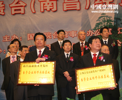 在儀式上,為此次設(shè)立的5個臺資企業(yè)轉(zhuǎn)移承接基地和5家臺商創(chuàng)業(yè)園進行了授牌。它們分別是:南昌高新技術(shù)開發(fā)區(qū)臺資企業(yè)轉(zhuǎn)移承接基地、南昌經(jīng)濟技術(shù)開發(fā)區(qū)臺資企業(yè)轉(zhuǎn)移承接基地、江西贛州經(jīng)濟開發(fā)區(qū)臺資企業(yè)轉(zhuǎn)移承接基地、江西吉安高新技術(shù)產(chǎn)業(yè)園區(qū)臺資企業(yè)轉(zhuǎn)移承接基地、江西上饒經(jīng)濟開發(fā)區(qū)臺資企業(yè)轉(zhuǎn)移承接基地,以及江西撫州金巢經(jīng)濟開發(fā)區(qū)臺商創(chuàng)業(yè)園、江西共青城臺商創(chuàng)業(yè)園、江西上高臺商創(chuàng)業(yè)園、江西瑞金臺商創(chuàng)業(yè)園、江西向塘臺商創(chuàng)業(yè)園。