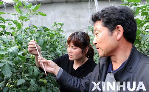 4月9日,來自壽光三元朱村的技術(shù)員王鳳華(右)為大棚種植戶朱桂英測定大棚溫度。新華社記者范長國攝