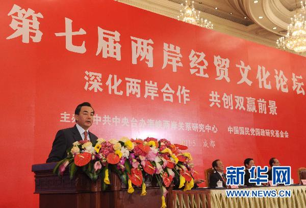 5月8日,第七屆兩岸經貿文化論壇在四川成都閉幕。中共中央政治局常委、全國政協主席賈慶林和中國國民黨榮譽主席吳伯雄出席閉幕會。這是中共中央臺灣工作辦公室主任王毅進行論壇小結。新華社記者 饒愛民 攝