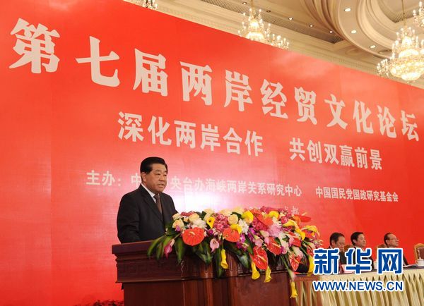 5月8日,第七屆兩岸經貿文化論壇在四川成都閉幕。中共中央政治局常委、全國政協主席賈慶林和中國國民黨榮譽主席吳伯雄出席閉幕會。這是中共中央政治局常委、全國政協主席賈慶林致辭。 新華社記者 饒愛民 攝