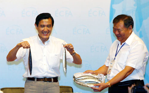 馬英九昨天到高雄市出席“兩岸經(jīng)濟(jì)合作架構(gòu)協(xié)議(ECFA)座談會(huì)”,與養(yǎng)殖、鋼鐵等業(yè)界座談。業(yè)者都非常感謝臺(tái)當(dāng)局簽訂ECFA,讓業(yè)界獲益良多。受益的業(yè)者甚至提來(lái)一堆秋刀魚、石斑送給馬英九,讓現(xiàn)場(chǎng)響起熱烈掌聲。