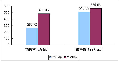 賽迪顧問市場監測數據顯示,2008年Q2中國閃存盤市場增長十分迅猛,實現總銷量490.36萬臺,與2007年同期相比增長88.1%;實現銷售額5.69億元,同比增長11.5%。閃存盤以其體積小巧、輕便耐用等特點,得到越來越多消費者的青睞,使得本季度同比增幅明顯高于上個季度。