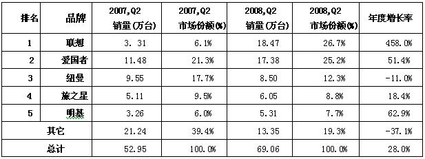 2008年Q2,愛國者依然占據市場第一的寶座,銷售量為132.32萬臺,占據27.0%的市場份額;而聯想不甘落后,通過推出聯想福娃、奧運火炬等閃存盤,跳脫出傳統的降價促銷,大手筆地拉開奧運促銷大幕,占據26.5%的市場份額,二者差距越來越小。
