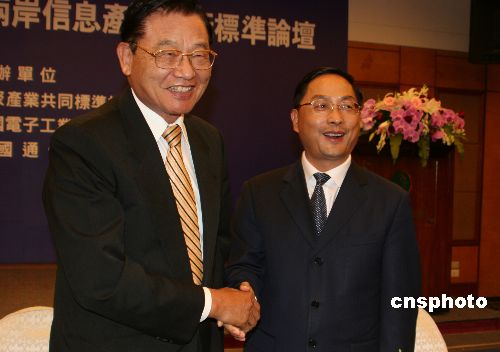| 5月11日,第二屆“海峽兩岸信息產業技術標準論壇”在臺北落幕,取得五項進展。圖為華聚產業共同標準推動基金會董事長江丙坤(左),與來自大陸的信息產業部副部長蔣耀平握手致意。 |