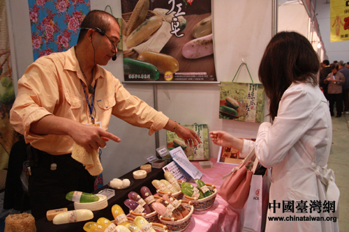 臺灣苗栗縣一家廠商生產的絲瓜絡美容香皂受到了女孩子的熱烈歡迎。(中國臺灣網 肖燕攝)