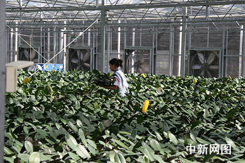 漳州富圣蘭花生物科技有限公司內一名員工在園區內修正蘭花