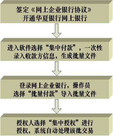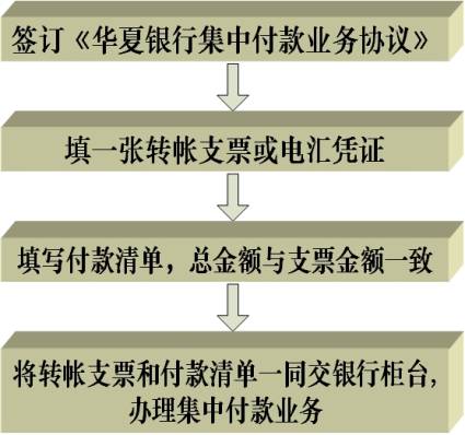 集中付款業(yè)務(wù)是指付款人在需要向多個(gè)收款人支付貨款時(shí),依據(jù)與我行簽訂的《華夏銀行集中付款業(yè)務(wù)合作協(xié)議》,向我行提交一張支票(或電匯憑證)和與匯款內(nèi)容對(duì)應(yīng)的支付清單,同時(shí)完成向多個(gè)收款人支付款項(xiàng)的結(jié)算業(yè)務(wù)。付款人也可以使用"華夏互連通"集中付款軟件錄入支付信息,通過(guò)華夏銀行網(wǎng)上企業(yè)銀行一次性向多家收款人進(jìn)行支付。