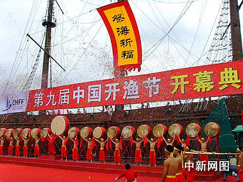 中新網寧波9月14日電(徐水根 葉琛琛 傅婷婷 肖康煥)九月十四日,首次邀請臺灣東森電視臺現場直播的第九屆中國(象山)開漁節開幕式暨祭海儀式,在寧波象山石浦皇城沙灘舉行。同時,臺灣臺東大學民俗表演團體也趕來助興,海峽兩岸攜起手來,擁護藍色海洋,為漁民祈福。