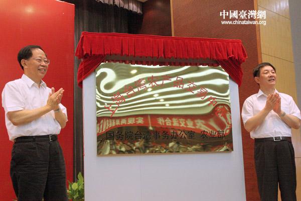 國臺辦副主任葉克冬(右)與農(nóng)業(yè)部副部長危朝安為“上海臺灣農(nóng)產(chǎn)品交易中心”揭牌。(中國臺灣網(wǎng) 邵磌 攝)
