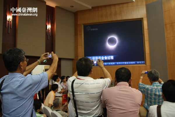 中國臺灣網(wǎng)7月22日上海消息 參加首屆“兩岸鄉(xiāng)村座談”的兩岸代表今天通過電視直播在上海青浦會議中心觀看了500年一遇的日全食景觀。代表們對日全食奇觀贊嘆不已、大呼過癮,紛紛表示這是他們本次來上海參加鄉(xiāng)村座談外的又一重大收獲。