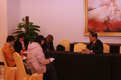 4月17日臺(tái)企聯(lián)換屆選舉結(jié)束后,選委會(huì)主任、臺(tái)企聯(lián)新聞發(fā)言人葉惠德向兩岸記者介紹了臺(tái)企聯(lián)換屆選舉結(jié)果及倡議為青海玉樹(shù)賑災(zāi)捐款的情況。