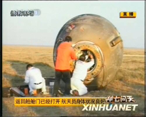 9月28日,神七返回艙艙門打開。 新華社發(電視截圖)