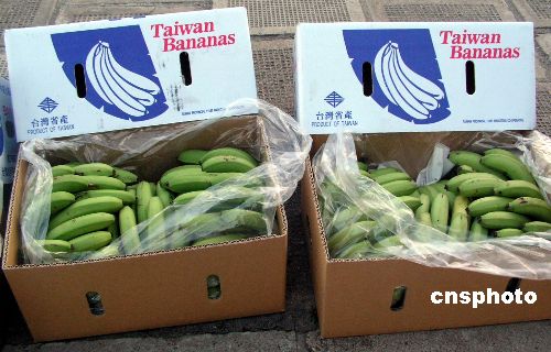 資料圖:十月三十一日,大陸緊急采購的首批臺灣豐產滯銷香蕉共七十五噸,在上海外高橋順利“過關”。今年十月中旬,兩岸農業合作論壇閉幕之際,中臺辦宣布大陸將收購三百噸島內過剩香蕉,以緩解島內果賤傷農之苦。這批外盒標有“臺灣省產”字眼的香蕉,還將在上海郊區的“蕉房”內接受烘制、催熟、分揀,最快于四、五天后以中檔價位在上海面市。 中新社發 小郭 攝