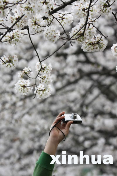 3月22日,一位游人在櫻花樹下賞花拍照。李理 攝