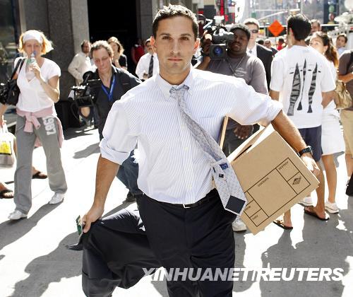 9月15日,在美國紐約,一名雷曼兄弟公司的雇員拿著裝有私人物品的紙箱離開公司。當日,美國第四大證券公司雷曼兄弟申請破產保護,意味著這家在華爾街生存了158年的老牌投資銀行將壽終正寢。新華社/路透