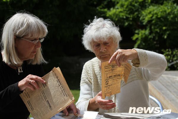 6月26日,在丹麥第二大城市奧胡斯郊區(qū)的一棟海濱別墅里,抗戰(zhàn)期間在南京救助和保護了近2萬名中國難民的丹麥友人貝恩哈爾·辛德貝格的妹妹比滕·安諾生(右)和外甥女瑪麗安娜·安諾生向記者展示有關南京大屠殺的史料。新華社發(fā)(林淼攝)