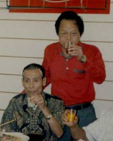 剛開完腦部手術的大哥張炆進與作者碰杯送行