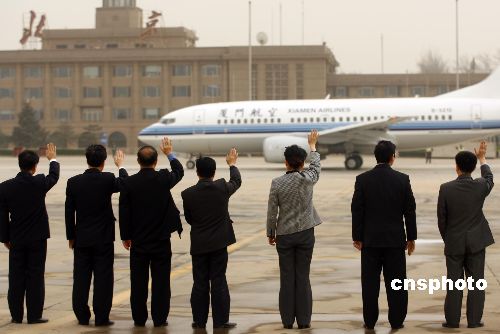四月十七日下午,中國國民黨榮譽(yù)主席連戰(zhàn)攜夫人離開北京飛往福建,開始福建的祭祖之旅,中共中央臺(tái)辦主任陳云林到機(jī)場(chǎng)送行。作者:盛佳鵬 來源:中新網(wǎng) (責(zé)任編輯:清水)