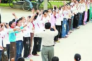 還未進江寨小學,記者就聽到風中傳來一陣稚嫩的呼喊聲:“歡迎,歡迎,熱烈歡迎……”兩隊小學生正在老師的指揮下面對面地站著,幾十只小手高舉,不斷做出揮舞鮮花的動作。原來他們正利用課余時間排練歡迎江丙坤的儀式。