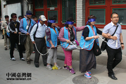 中國臺灣網5月15日北京消息 臺灣2013兩岸NPO發展與推動交流參訪團今天上午來到北京紅丹丹教育交流文化中心,在志愿者的引導下,切身體驗了盲人的日常生活以及他們是如何欣賞影視作品的。