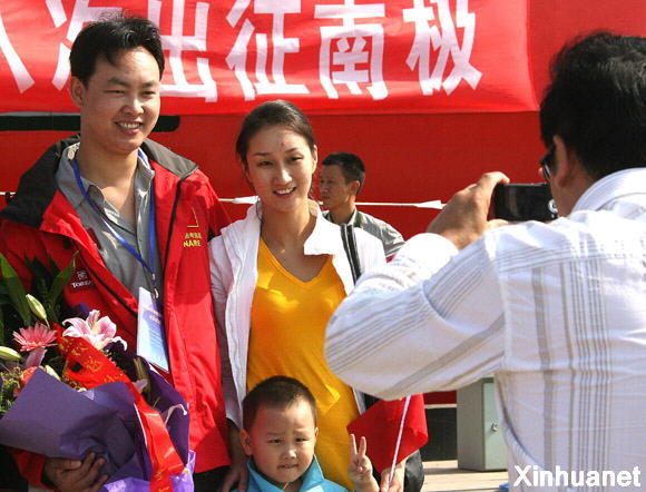 10月11日,即將出發(fā)的南極科考隊(duì)員諸錦嶸(左一)與家人合影留念。 新華社記者陳飛攝