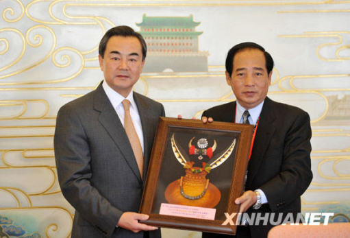 12月22日,王毅接受臺灣少數民族代表人士訪問團贈送的禮品。新華社記者 金良快 攝