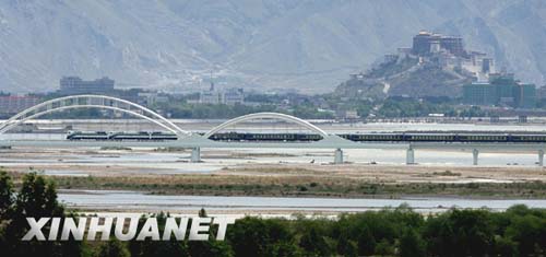 資料圖片:2006年7月1日11時(shí)20分許,由拉薩發(fā)出的“藏2”次慶典列車通過(guò)拉薩河特大橋。當(dāng)日,青藏鐵路全線通車。 最新統(tǒng)計(jì)顯示:2007年西藏自治區(qū)生產(chǎn)總值超過(guò)342億元,人均GDP超過(guò)1.2萬(wàn)元,按可比口徑計(jì)算均比2002年翻了近一番,西藏經(jīng)濟(jì)實(shí)現(xiàn)了連續(xù)7年保持12%以上的增速跨越發(fā)展。西藏經(jīng)濟(jì)的快速發(fā)展凝聚了中央政府的殷殷關(guān)切。從一批又一批大型基礎(chǔ)設(shè)施建設(shè),到對(duì)農(nóng)牧民醫(yī)療衛(wèi)生保障、教育、文化保護(hù)等社會(huì)事業(yè)的大力支持,來(lái)自中央財(cái)政的資金援助和政策扶持為西藏經(jīng)濟(jì)社會(huì)事業(yè)的發(fā)展注入活力。 新華社發(fā)