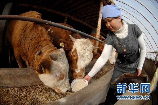 3月1日,寧夏同心縣新華村的回族移民李彥福老人的女兒李梅花在家里喂牛。走進位于寧夏回族自治區同心縣的回族移民新村新華村,映入眼簾的是一排排整齊的磚瓦房,干凈的砂石路從村頭一直通到村尾,路上不時傳來孩子們嬉笑玩鬧的聲音。 新華社記者 彭昭之 攝
