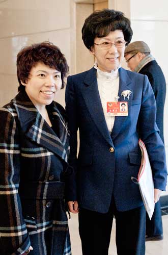 圖為全國政協委員李冬冬和全國政協委員鄧亞萍合影。(記者肖春陽 閆文)