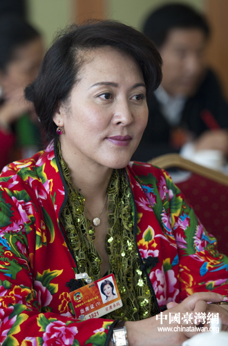 圖為全國政協委員宗庸卓瑪身著民族服飾參加會議。