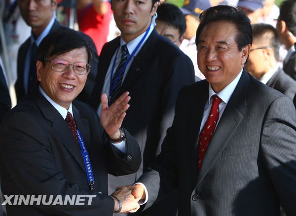 11月5日,陳云林(右)和新竹科學工業園區管理局局長顏宗明握手。當日,海協會會長陳云林參觀新竹科學工業園區。新華社記者 邢廣利 攝