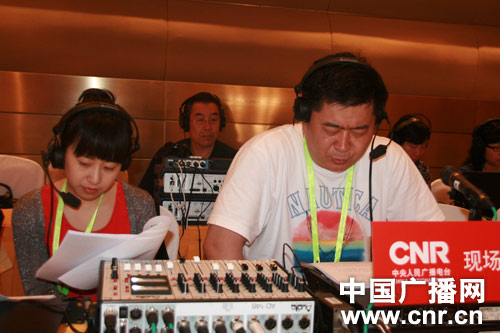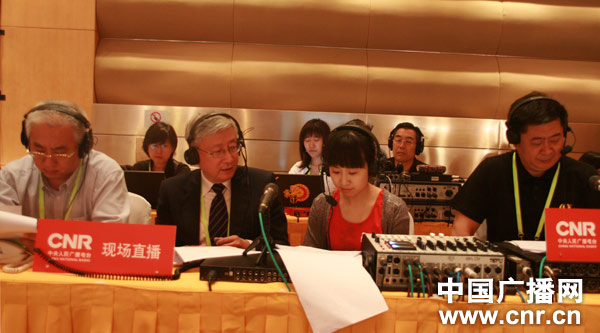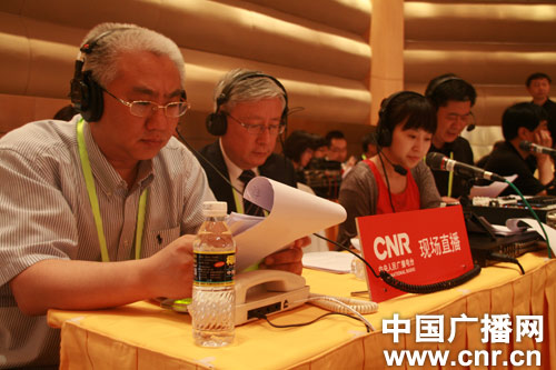 中央臺副總編劉曉龍(左一)在會場指揮報道工作,中央臺特約評論員曹景行現場評點博鰲亞洲論壇2011年會開幕式盛況