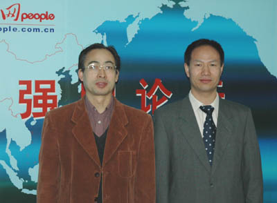 2006年2月,中國社會科學院臺灣研究所經濟室主任孫升亮(右)、研究員王建民(左)接受人民網訪問。(圖片來源:人民網)