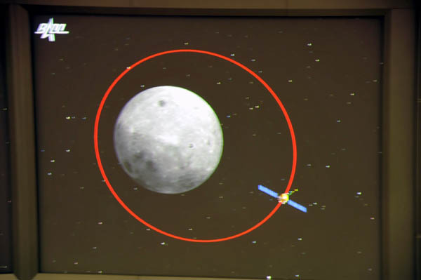 北京飛控10月9日將對(duì)嫦娥二號(hào)衛(wèi)星進(jìn)行第三次近月制動(dòng),確保衛(wèi)星順利進(jìn)入高度為100公里的環(huán)月圓軌道。圖為完成第二次近月制動(dòng)后的嫦娥二號(hào)衛(wèi)星運(yùn)行軌道模擬圖。新華網(wǎng) 孫瑞博攝
