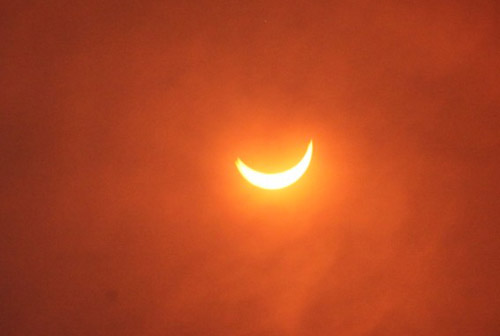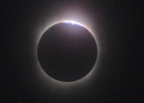 天空越來越暗,主持人停止了講解,只有忽然而過的風與楊柳上的知了時不時的碰撞出“吱嗚”的聲音,在場的人們拿起自己手中的望遠鏡、相機用力的透過鏡頭看著空中。漸漸的,天空亮出一圈淡淡的光環,接著凸出一顆、兩顆的小光點。“看,那是貝利珠”有人激動的喊著。天空光明大作,太陽再次慢慢的展現出它的全貌,全場歡呼不絕于耳。