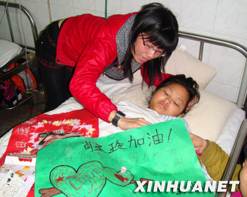 在湖南長沙一家醫院,肖玉玲的班主任帶著同學們的祝?赐び窳幔3月30日攝)。新華社發