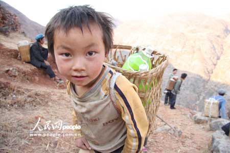 每天,村民們從海拔1800米左右的村莊出發(fā),沿著一條坡度多在60度左右的蜿蜒的羊腸小道,步行下到海拔1100左右的牛欄江邊,用肩挑背扛的方式運水回家。4公里左右陡峭的山路,青壯年勞力往返一趟也要兩個半小時。
