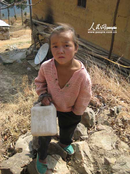 這是一個極度缺水的小村莊。持續(xù)干旱使村里的水窖全部干涸,小春作物基本絕收。由于交通極其不便,鄉(xiāng)政府安排的送水車每天只能保證將8方左右的水送到村里的五保老人、殘疾人等特殊困難人群家里,絕大部分村民需要步行背水。