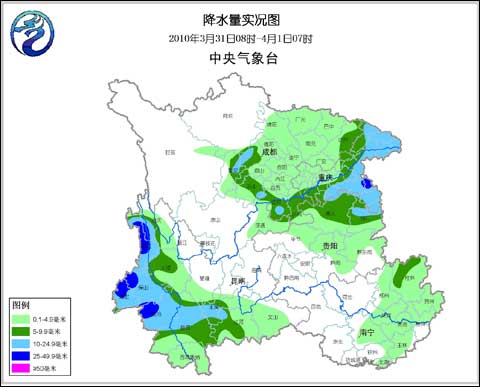 西南地區(qū)降水量實(shí)況圖(2010年3月31日08時(shí)-4月1日07時(shí))
