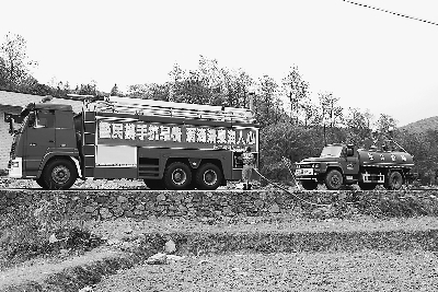 4月1日,貴州省黔西南州興仁縣消防大隊用消防車給魯礎營回族鄉抗旱救災拉水車送水。