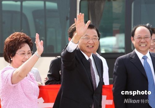 十一日下午三時(shí)十五分許,臺(tái)灣海峽交流基金會(huì)董事長(zhǎng)江丙坤率海基會(huì)代表團(tuán)抵達(dá)北京首都機(jī)場(chǎng),向在場(chǎng)的中外媒體揮手致意。 中新社發(fā) 趙振清 攝