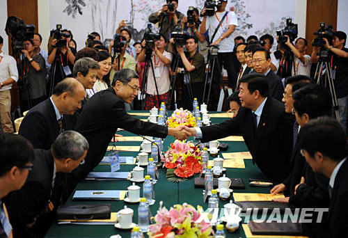 6月12日下午,海峽兩岸關系協(xié)會與海峽交流基金會在北京釣魚臺國賓館就大陸居民赴臺旅游議題進行協(xié)商。這是海協(xié)會副會長孫亞夫(右)和海基會副董事長高孔廉握手。 新華社記者李曉果攝