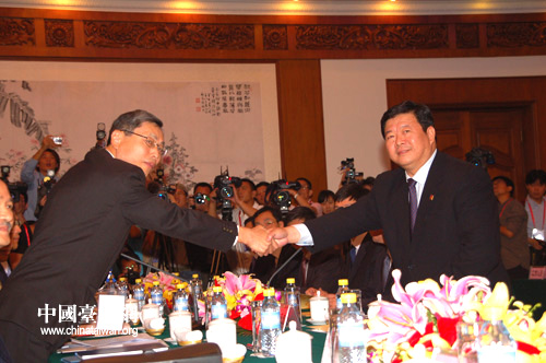 海協會執行副會長孫亞夫與海基會副董事長兼秘書長高孔廉在協商前握手。(攝影:中國臺灣網 田云鵬)