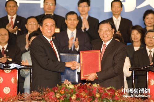 海協會會長陳云林與海基會董事長江丙坤簽署海運、空運、通郵和食品安全等四項協議。中國臺灣網 田云鵬攝