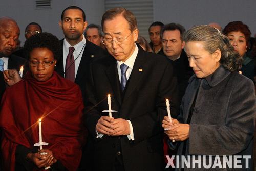 1月19日,在紐約聯(lián)合國總部,聯(lián)合國秘書長潘基文(前中)手持蠟燭參加為海地地震遇難者舉行的燭光悼念活動。當(dāng)日,聯(lián)合國總部舉行花圈敬獻儀式和燭光悼念活動,向在海地地震中遇難的聯(lián)合國工作人員及所有的地震遇難者表示哀悼。新華社發(fā)