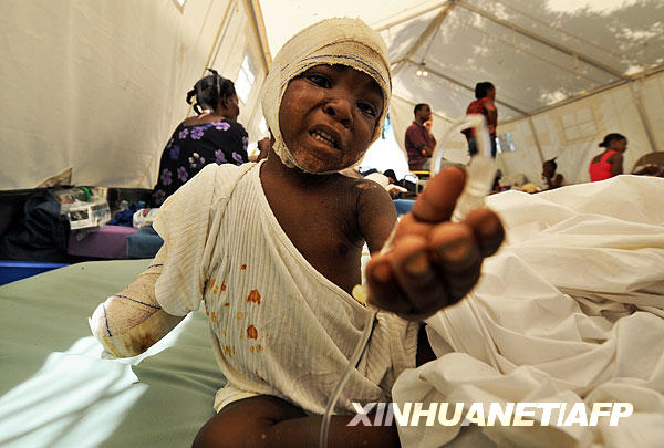 1月23日,在海地首都太子港,一名在地震中失去一只手的4歲兒童在臨時醫(yī)院中等待手術(shù)。新華社/法新
