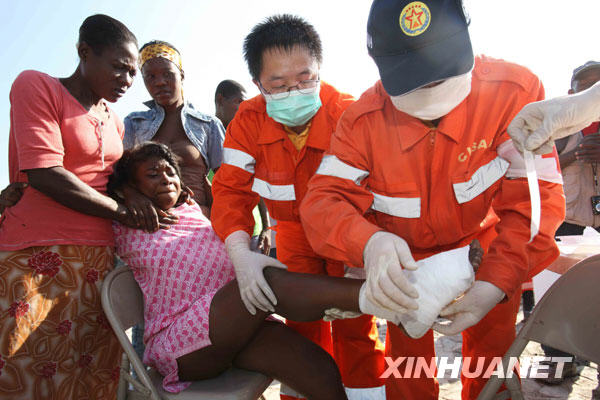 1月18日,中國國際救援隊醫生在海地首都太子港總統府廣場前為一名受傷的女孩包扎傷口。新華社記者袁滿攝