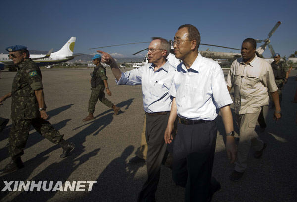 1月17日,聯(lián)合國(guó)秘書(shū)長(zhǎng)潘基文(前)抵達(dá)海地首都太子港,開(kāi)始對(duì)地震災(zāi)區(qū)視察。